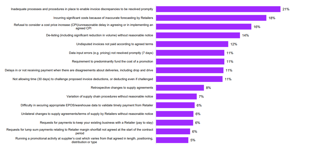Contract Variations: 14% of suppliers highlighted issues with variations in supply agreements and terms, typically enacted without reasonable notice